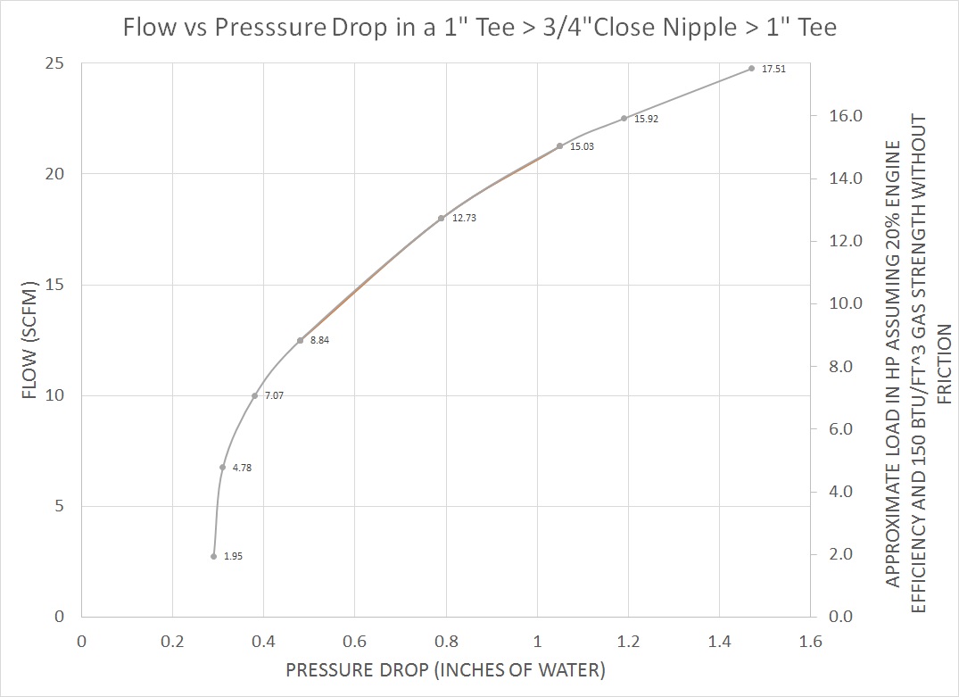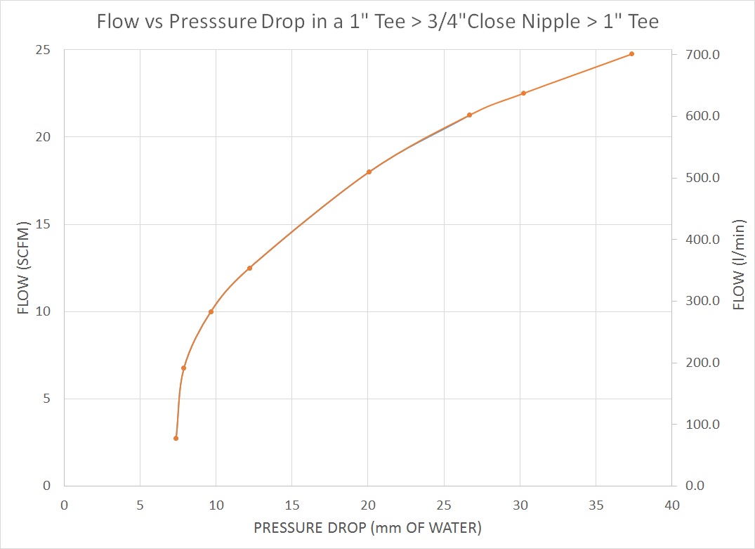 The clear tubing is a “U” shaped water manometer to measure the pressure drop across the close nipple acting as a restriction. To measure the gas flow through the device, measure the difference in water column heights in the manometer and use the calibration chart below: