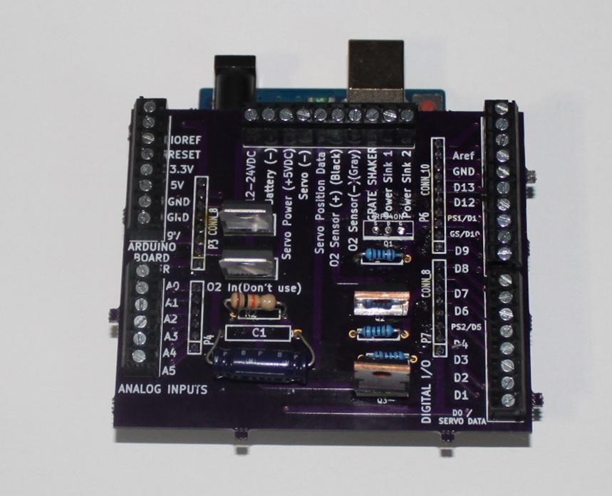 It is a true custom Arduino shield which uses an automotive oxygen sensor and can run on 12-24V. It also has three channels of power sinks hooked to pulse width modulation pins. In English that means it has three power circuits which can make variable voltages for things like driving variable speed DC fans.