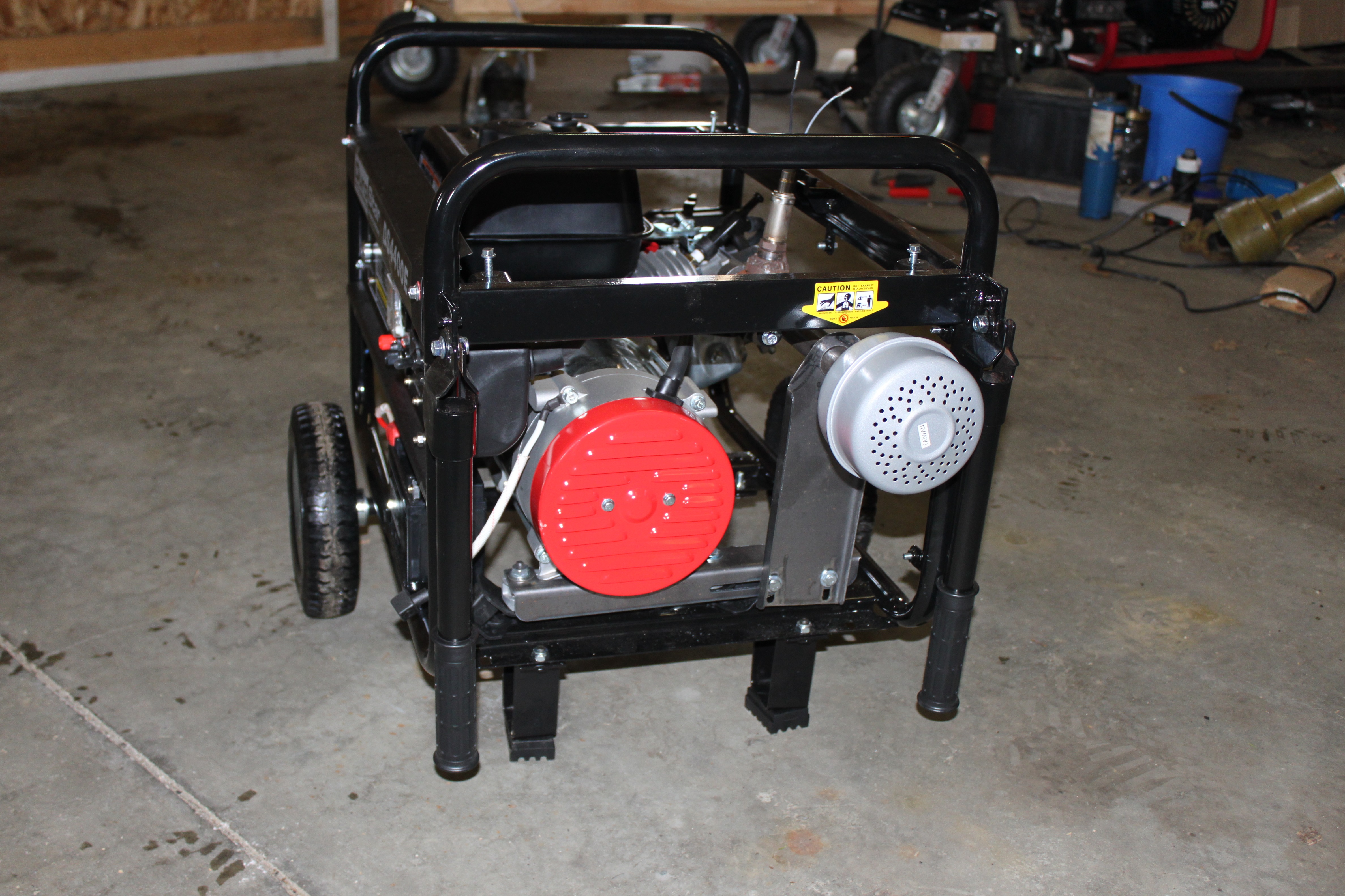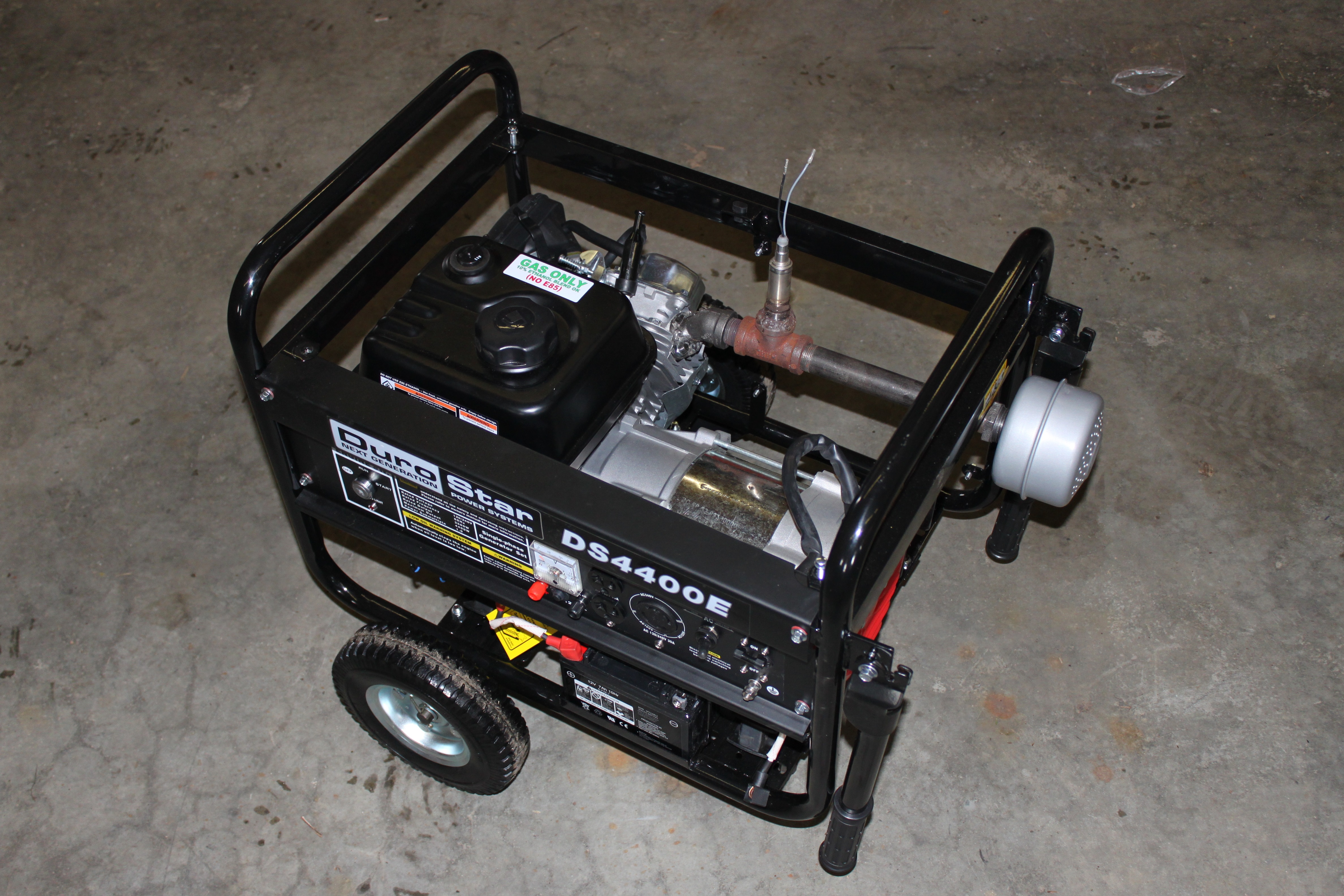 The engine only had a flanged exhaust interface so I had to make an NPT threaded exhaust manifold. These will be available under the “Get Hardware” tab at the top of the page. I was able to weld an O2 sensor bung from Carquest over a 3/4 tee, screw in a close nipple, the tee, and screw on a universal muffler. There are also custom brackets which go down to the generator frame to support the overhung load.