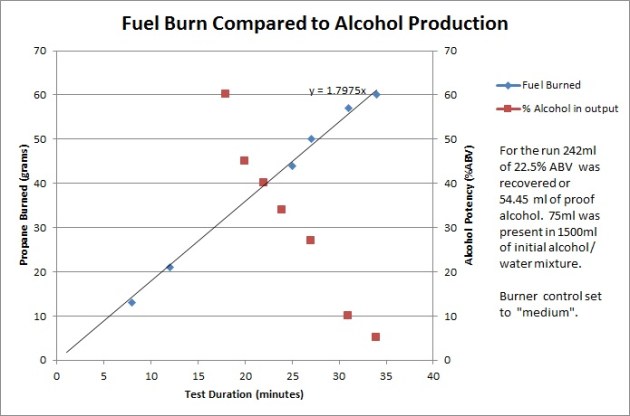 I have finally had time to build a reflux still which is one of the three allowable units on my Alcohol Fuel Plant permit. The performance improvement over my old pot still is amazing. I have standardized my performance testing by using a constant 1500ml of alcohol/water mix containing 75ml of pure alcohol. I settled on this 5% mixture because it is the best I have been able to do using a corn mash with no added sugar. Remember, we are making fuel so the cost of refined sugar is out of the question. Here is the data from my last run: