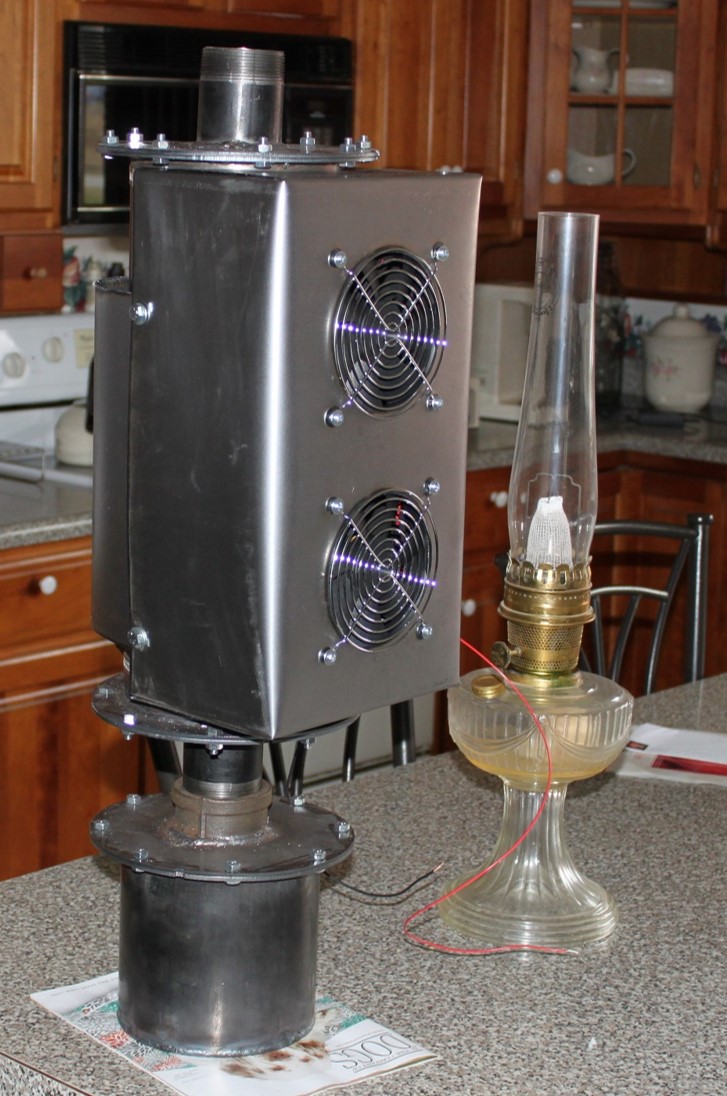 This is the gas cooler option shown on a 4″ cyclone. It uses a 25W fan to cool the gases. Please note, this is a test cyclone not a production unit. I would be horrified if that welding were sold. It is capable of lowering a 17cfm flow from 250F to 150F or a 12cfm flow from 750F to 350F. This assumes the unit is clean. A layer of tar can degrade its heat transfer capacity badly.